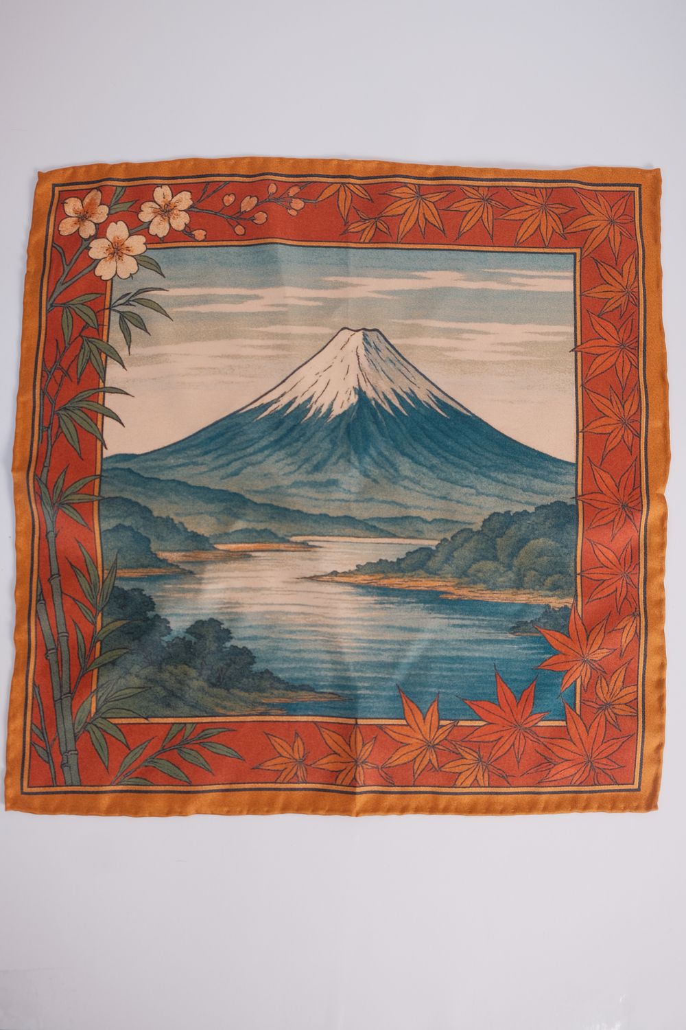 Dieses handgefertigte Einstecktuch aus 100 % reiner Seide bringt ein Stück japanische Ästhetik direkt in dein Outfit. Im kunstvollen Design vereinen sich zwei klassische Motive: der majestätische Fuji-san, umrahmt von leuchtendem Ahorn (Momiji) und Bambuszweigen, sowie ein eleganter Kranich im Flug, begleitet von zarten Kirschblüten (Sakura) – Sinnbilder für Schönheit, Neubeginn und den besonderen Moment.