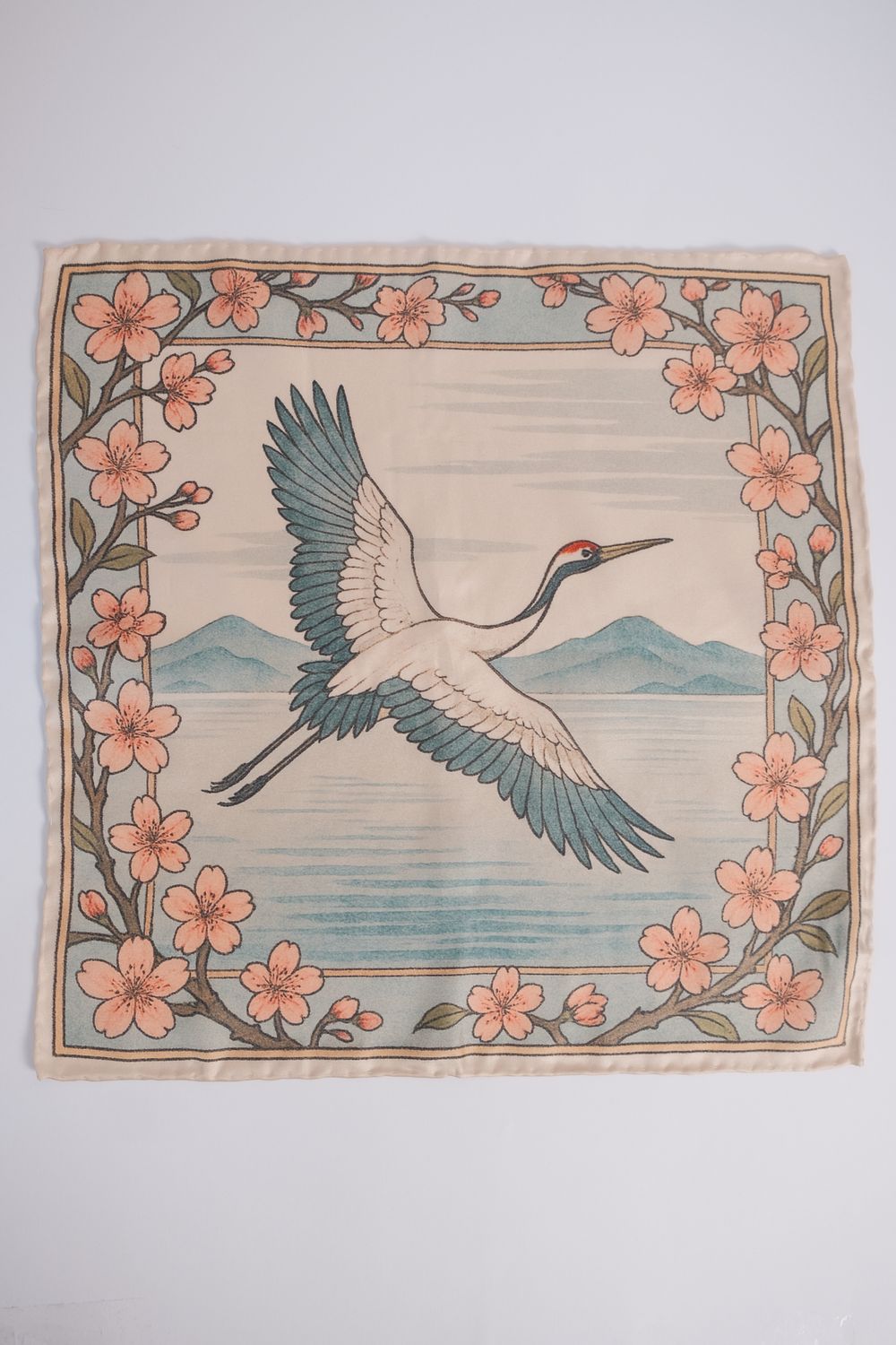 Dieses handgefertigte Einstecktuch aus 100 % reiner Seide bringt ein Stück japanische Ästhetik direkt in dein Outfit. Im kunstvollen Design vereinen sich zwei klassische Motive: der majestätische Fuji-san, umrahmt von leuchtendem Ahorn (Momiji) und Bambuszweigen, sowie ein eleganter Kranich im Flug, begleitet von zarten Kirschblüten (Sakura) – Sinnbilder für Schönheit, Neubeginn und den besonderen Moment.